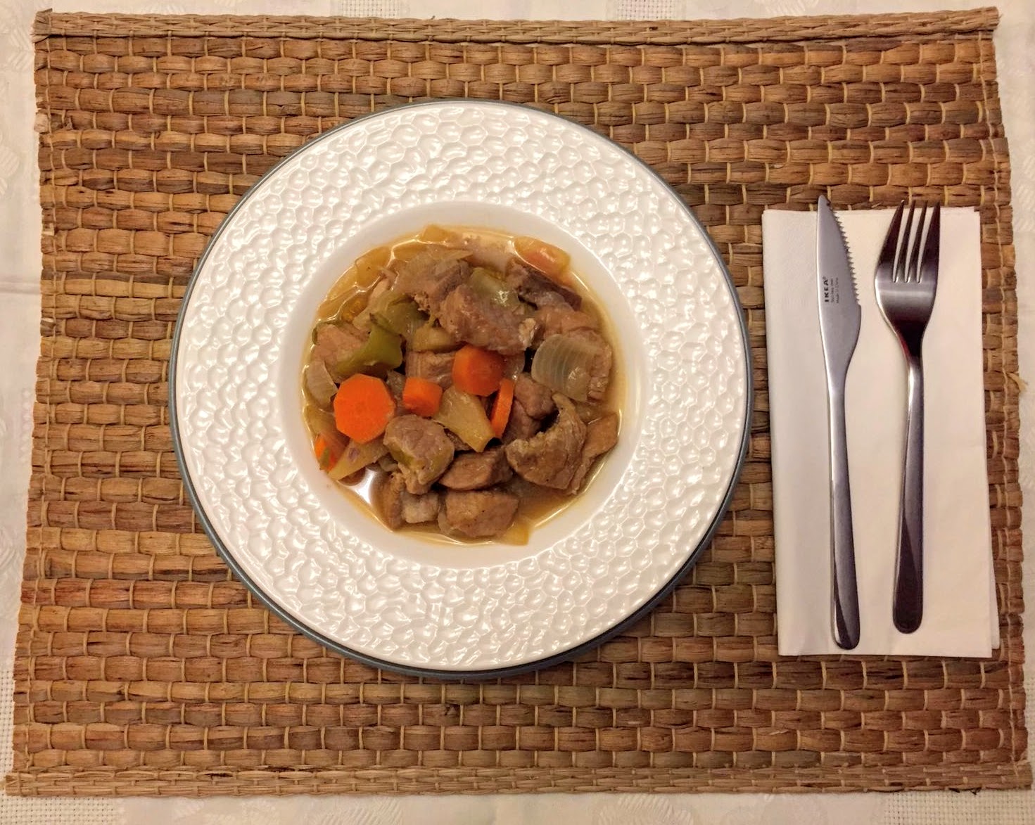 Lo primero que haremos será elegir carne magra de cerdo, que esté cortada en trozos. Podéis comprarla en los supermercados, normalmente envasadas en bandejas (cerdo para guiso), sino podéis pedirle al carnicero que os corte cerdo para guisar.