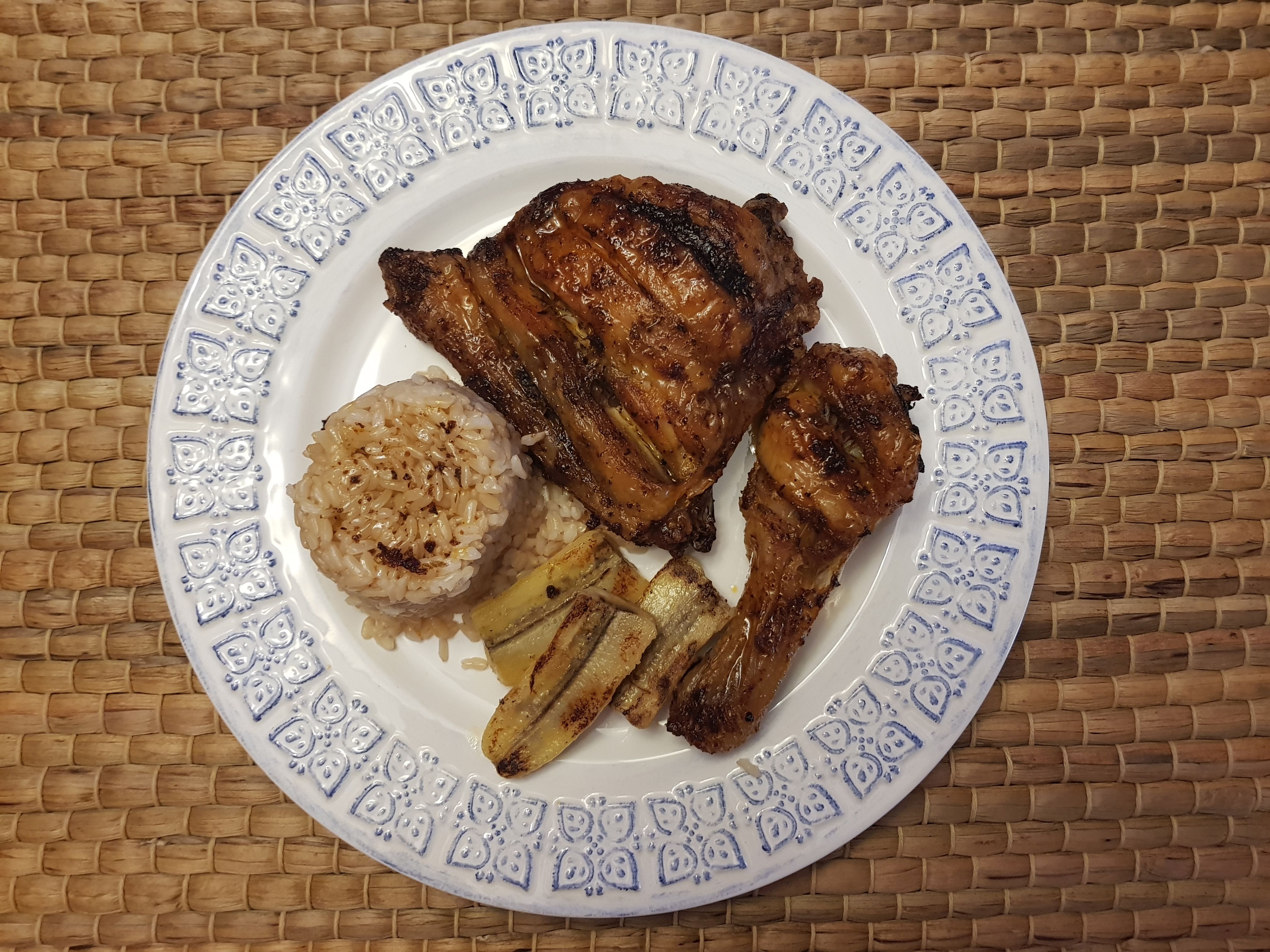 Como acompañamiento yo he utilizado arroz cocido integral y plátano a la plancha con mantequilla, ya que el sabor dulce combina muy bien con el picante.